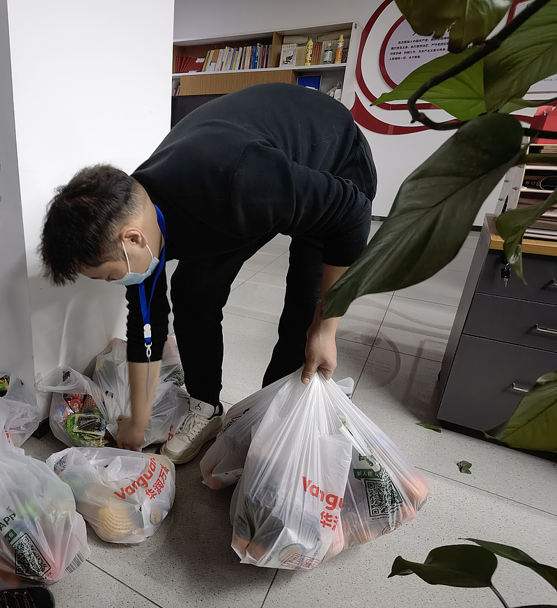 張謹(jǐn)為住在辦公室的同事打包準(zhǔn)備慰問品